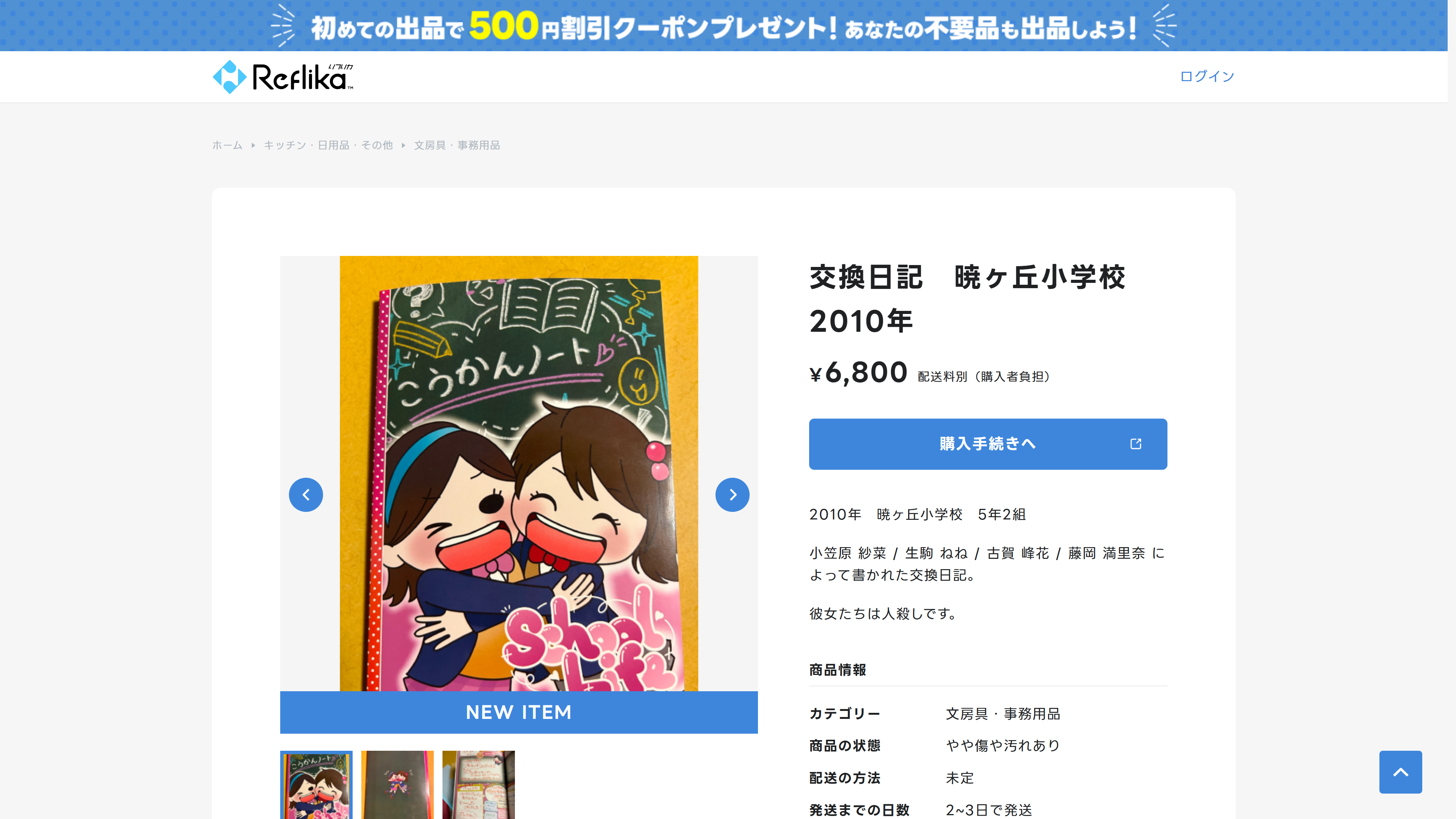 この交換日記はフリマサイト「メルカリ」で実際に販売され話題となり、わずか50分で完売。商品説明には「2010年暁ヶ丘小学校5年2組 小笠原 紗菜 / 生駒 ねね / 古賀 峰花 / 藤岡 満里奈によって書かれた交換日記。彼女たちは人殺しです。」と記載されており、ご自宅にこの交換日記が実際に届きます。