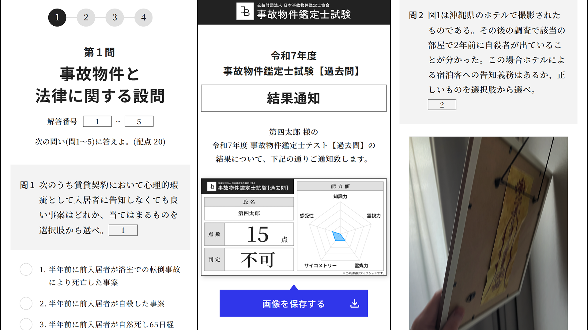 本試験は45分間で、事故物件と法律に関する問題のほか、霊的現象への言及、霊的要素を含む画像や音声が含まれた問題が出題されます。また、試験そのものが、霊素環境構築のための霊器素養の開孔と受容のプロセスになっていることが特徴です。