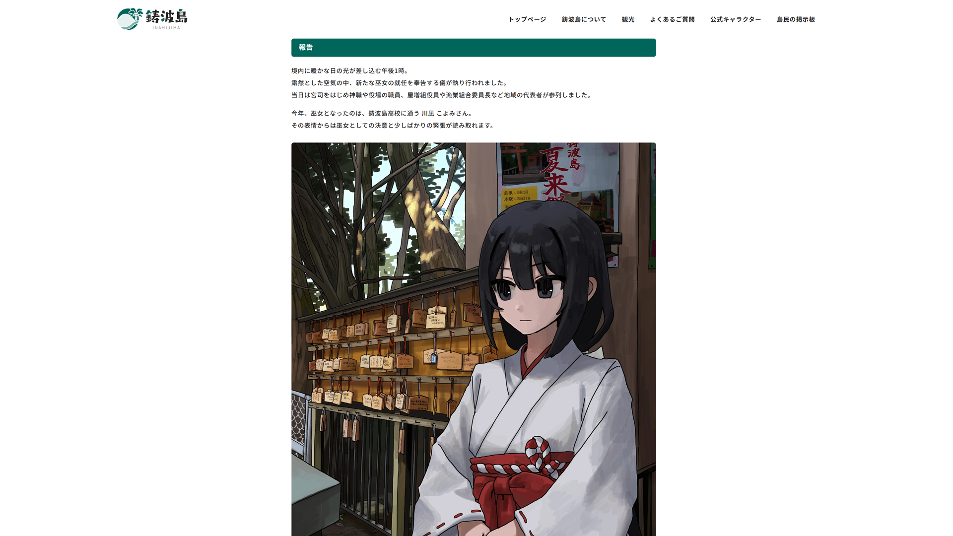 瀬戸内海に浮かぶ小さな島「鋳波島」で暮らす高校三年生。2025年の夏、彼女は島の伝統的な祭り「夏来祭」の巫女に選ばれることとなった。